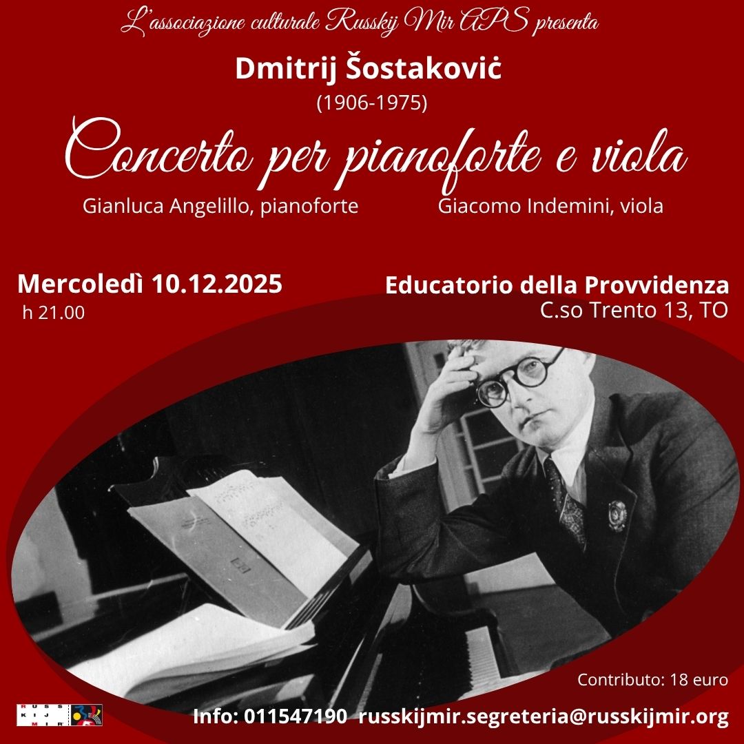 Shostakovich, concerto per pianoforte e viola 10/12/2025 21:00 Educatorio della Provvidenza - Corso Trento 13 - Torino 18,00 € Con Gianluca Angelillo al pianoforte e Giaconomoo Indemini alla viola CONTATTACI